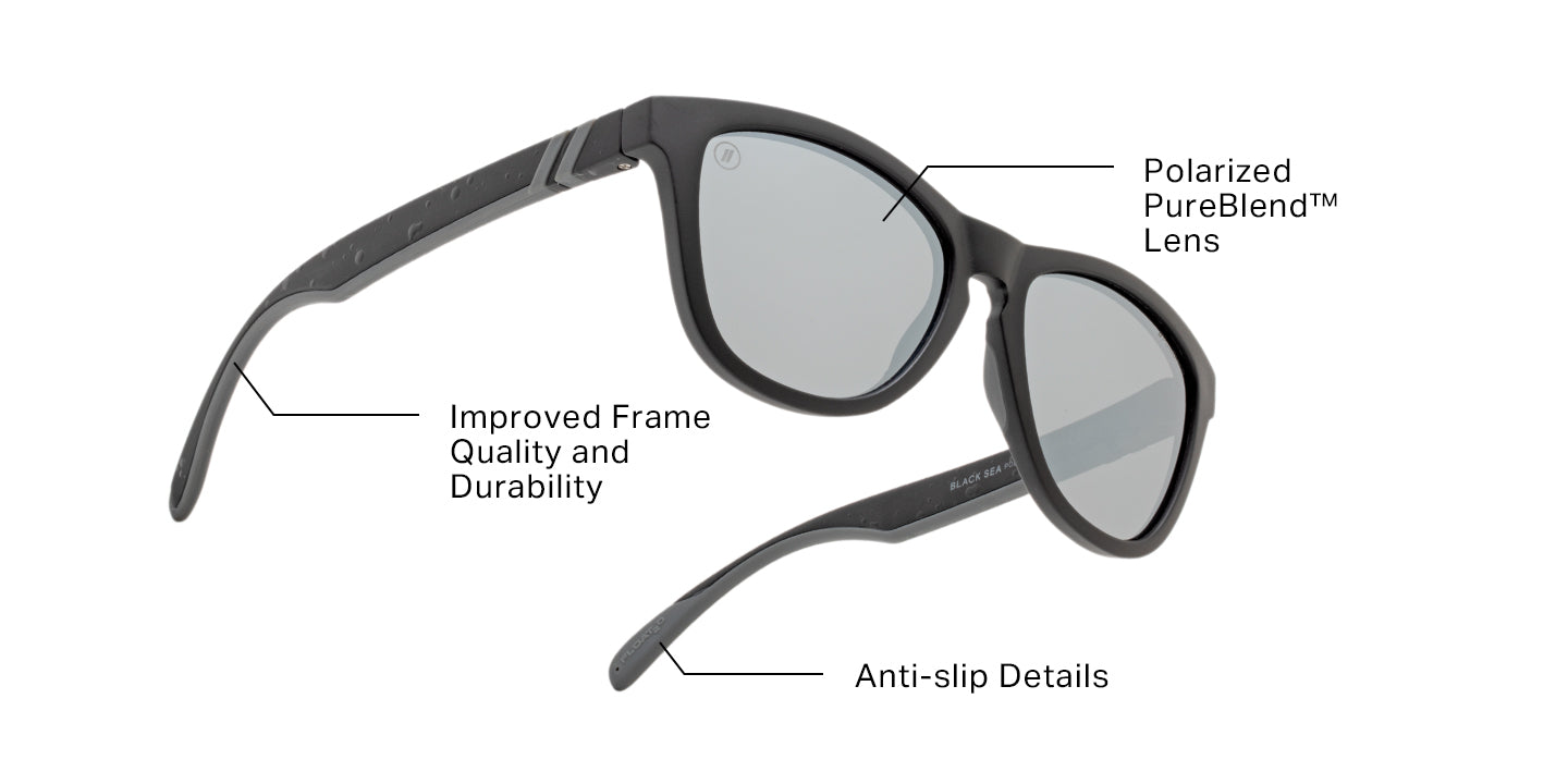 ‘Black Sea’ has a serious hidden talent: floatability! Thanks to a lightweight, Italian-sourced frame material, these polarized sunglasses are effortlessly buoyant in water. And with the superior scratch resistance of our PureBlend™ Lens, rubberized details for all-day comfort, and a water splatter effect on the temples, you’ll be experiencing your day in a whole new way.