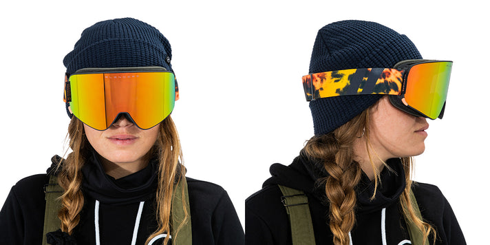 Our ‘Aura’ collection gets a major assist thanks to the spicy style of ‘Flame Mingo.’ The killer combo of a peach mirror lens with a black & peach tie dye strap is sure to set the slopes ablaze, but it’s the firestorm of performance features that will really up your boarding game. The cylindrical lens is low-profile and treated with anti-fog, anti-scratch, and anti-smudge coatings, and that moneymaker of yours will totally dig the premium comfort of high-density, hypoallergenic foam. And don’t forget about supremely simple magnetic lens swapping!