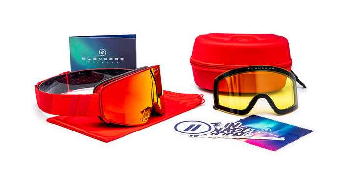 Scorch the slopes with 'Scarlet Heat.' We’ve matched a matte-finished red body with our stunning Sierra Red lens for a fiery aesthetic. Raised Blenders logos on the color-blocked no-slip strap add a pop of extra detail. Performance-focused features include scratch-resistant, anti-fog coatings and the easy swap functionality of our Rapid Magnetic Interchangeable Lens System.