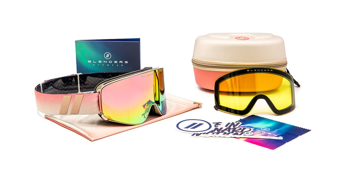 We’re all about bonuses at Blenders. With every ‘Aura’ goggle, you’ll receive a complimentary, matching Ethylene Vinyl Acetate (EVA) case, renowned for its durability and toughness. Also included is a matching drawstring cinch pouch and a spare low-light lens to help you slay the slopes no matter the conditions.