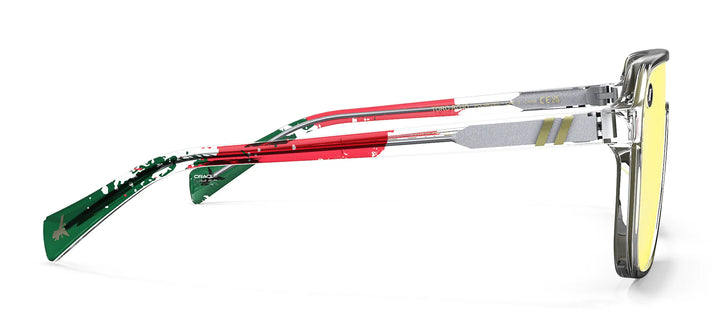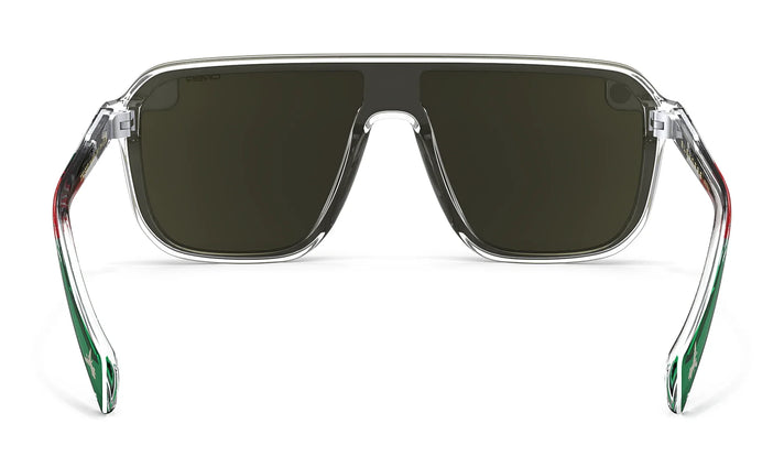 The Oracle Red Bull Racing Collection 'Toro Rojo' shades are a limited-edition tribute to the speed, style, and tradition of the Mexico City Grand Prix. We’ve splashed the crystal-clear temples with red and green in a proud nod to the Mexican flag and detailed each tip with the silhouette of the famed El Ángel de la Independencia monument. Our polarized, scratch-resistant PureBlend™ Lens — present in shimmering gold — takes the checkered flag.